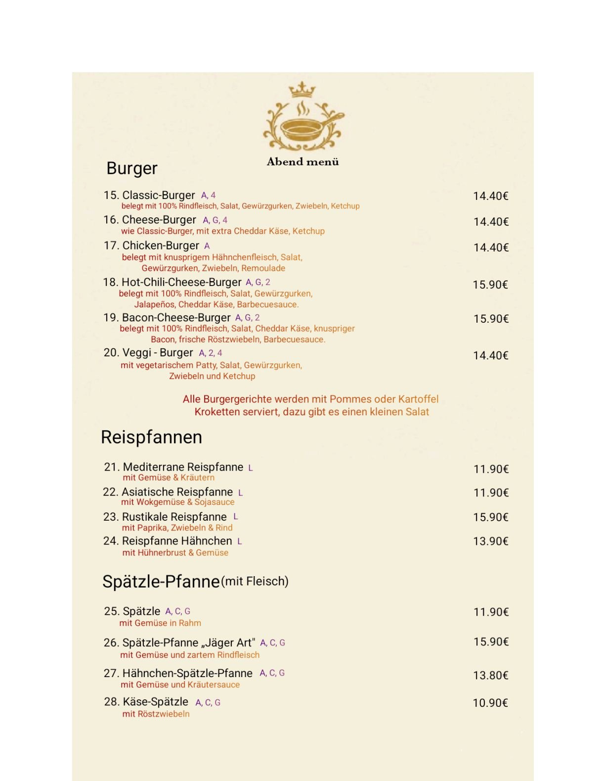 Ob Sie Lust auf einen herzhaften Cheeseburger, duftendes Thai-Curry oder ein traditionelles Schnitzel mit Kroketten haben – in der Goldenen Pfanne findet jeder sein Lieblingsgericht. Unsere Küche vereint das Beste aus verschiedenen Kulturen – für ein einzigartiges Geschmackserlebnis.